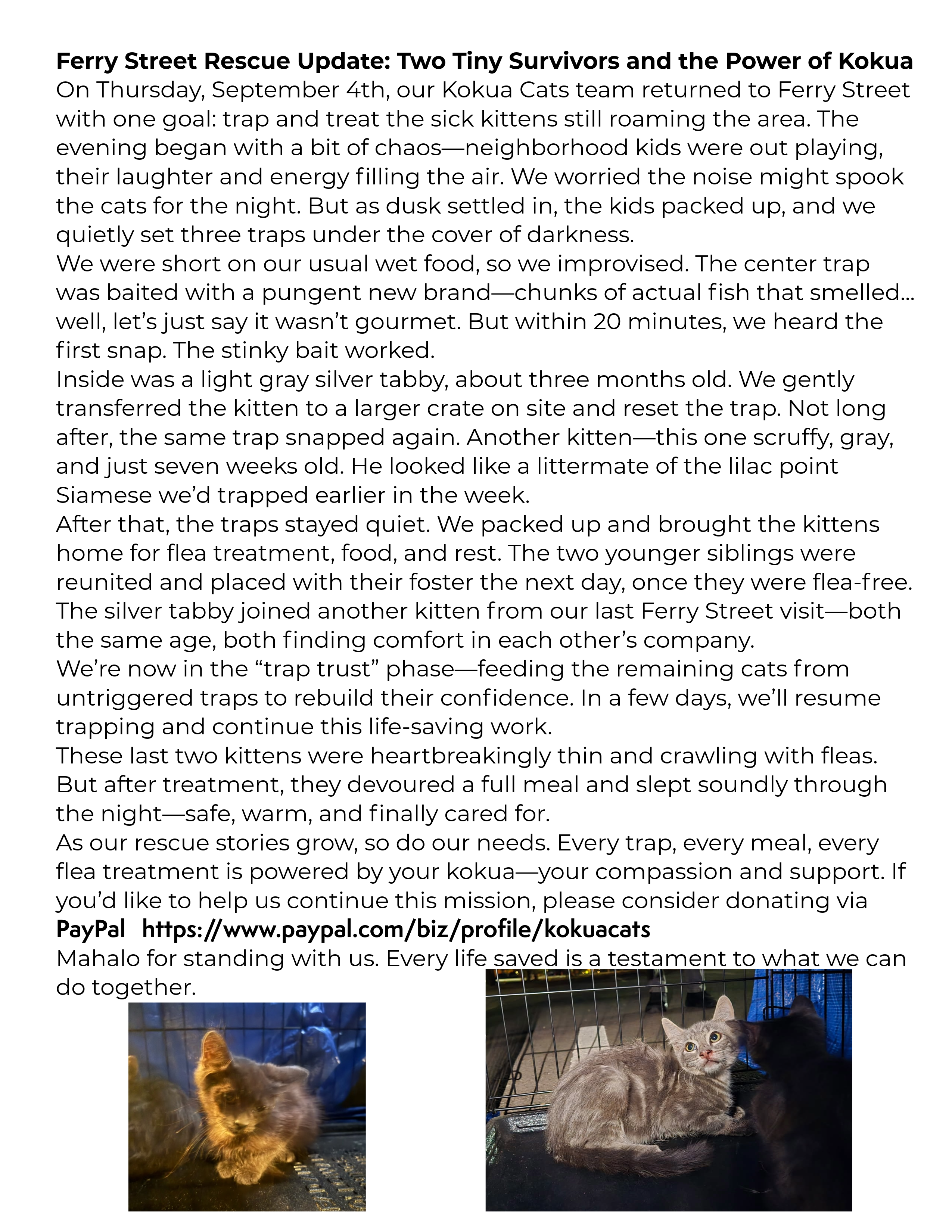You can make a difference in the lives of the Stray and Feral Street Cat Colonies in Albany, Oregon. It's time this issue be addressed and Kokua Cats needs Fosters!